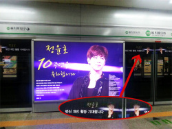 地下鉄の乗り場のところに東方神起チョン•ユノのデビュー10周年をお祝いするポスターが飾ってあ・・・