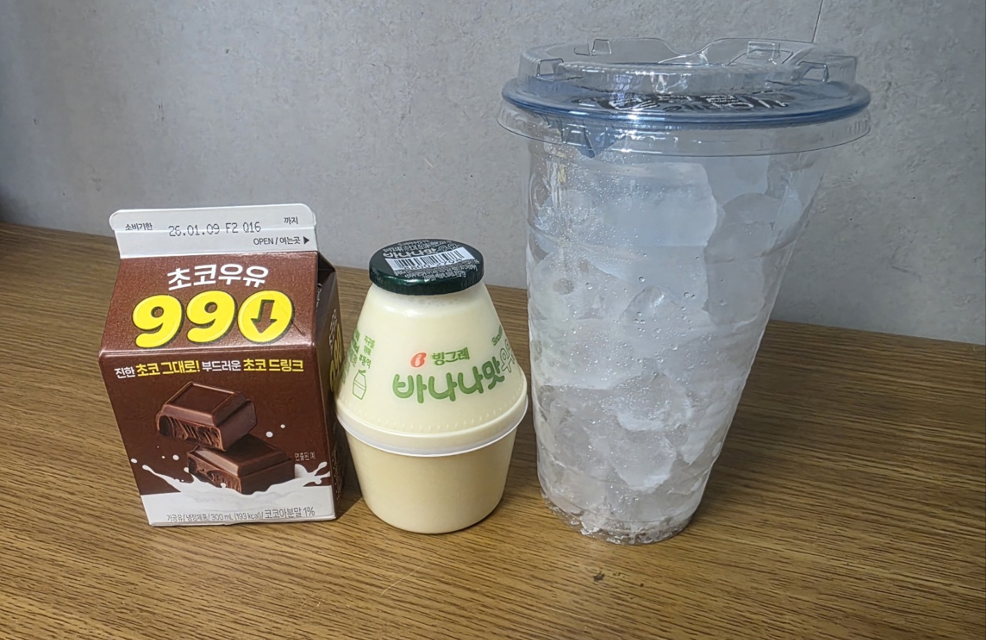 まずは準備から。韓国旅行中、または韓国在住の方なら、韓国のコンビニでバナナ味ミルク・チョコ牛乳・氷カップを用意しましょう。