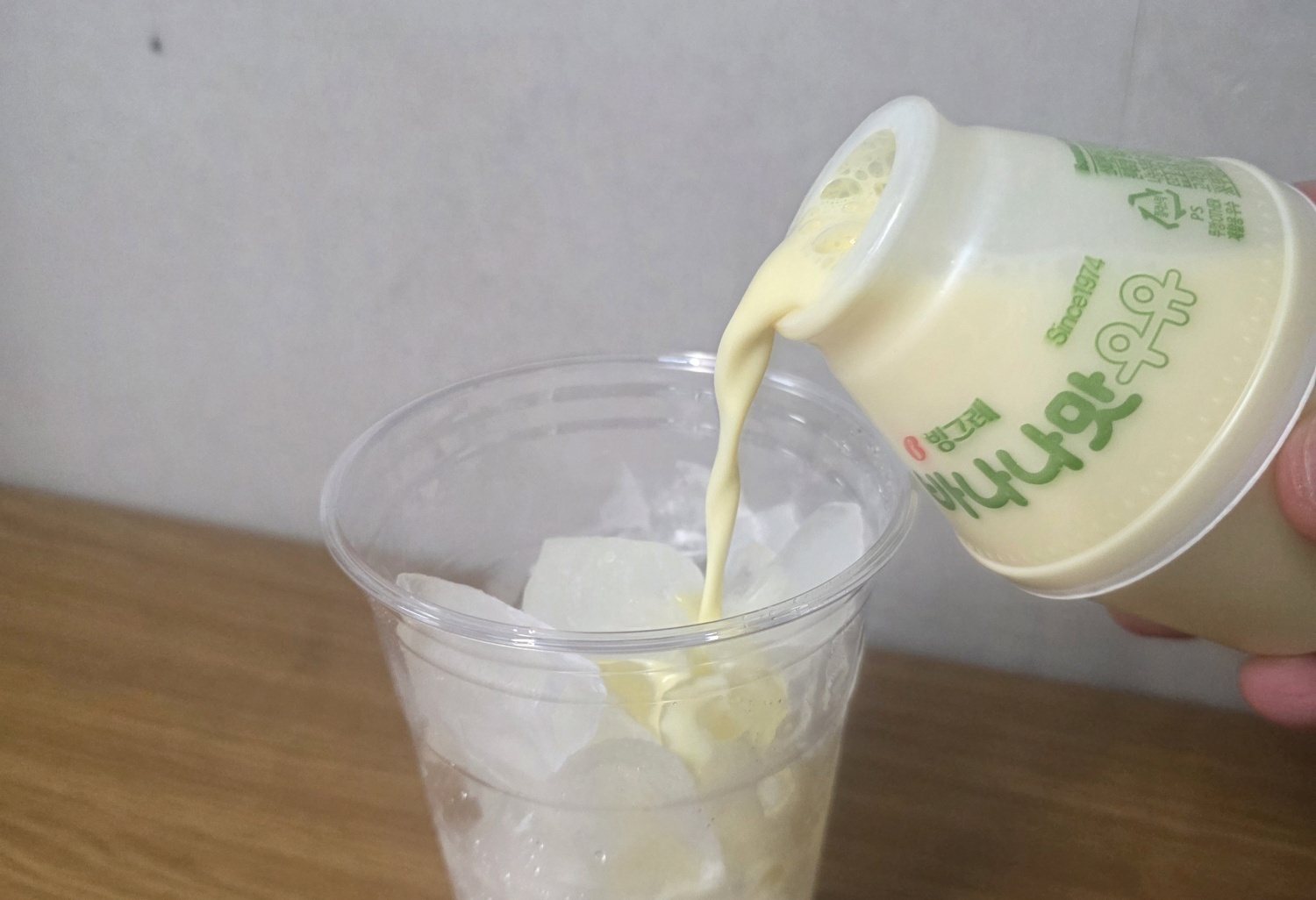 1.まず氷カップを開けて、バナナ味ミルクを注ぎます。